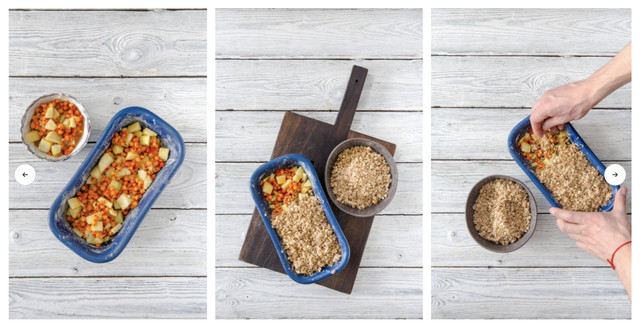 6. Рівномірно посипте фрукти крихтою тесту. Поставте в гарячу духовку і випікайте до рум'яної скоринки, приблизно 30 хв. Подавайте гарячим або остившім.