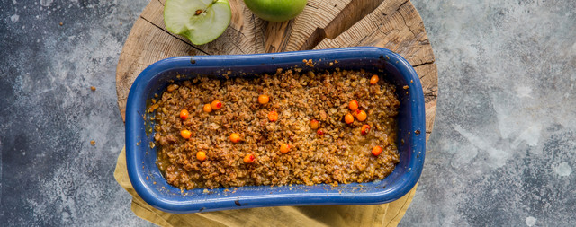 Пирогом складно здивувати — їх печуть або хоча б купують майже всі. Але зимовим пирогом з обліпихою, яблуками і ялівцем від Nordic ви здивуйте своїх близьких! Яскрава начинка з обліпихи і яблук, посипаних ялівцевим цукром, дуже вдало доповнюється хрустким «тестом» з вівсяних пластівців, яке готується буквально за 2 хвилини. Просте і корисне блюдо для свят і будніх днів.
